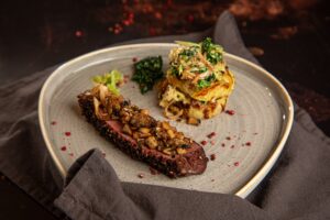 magret canard aux poivres, rösti PDT, confit chou vert, champis sautés_2-min (1)